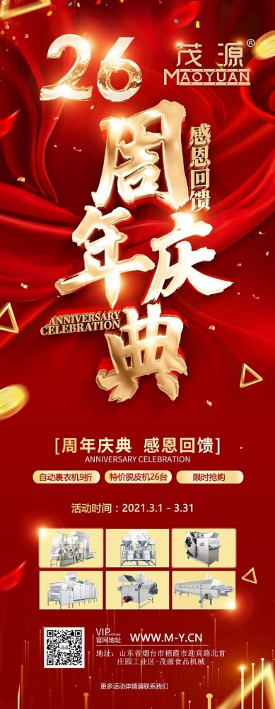 煙臺(tái)茂源食品機(jī)械即將迎來26周年慶,為感謝新老客戶長期以來的支持與信任,現(xiàn)特推出以下感恩回饋活動(dòng):單工位、雙工位自動(dòng)裹衣機(jī)原價(jià)15.6萬元、25.6萬元基礎(chǔ)上降價(jià)10%,并隨機(jī)贈(zèng)上料機(jī);碳鋼180型濕法花生米脫皮機(jī)特價(jià)9000元,限量26臺(tái),先到先得!